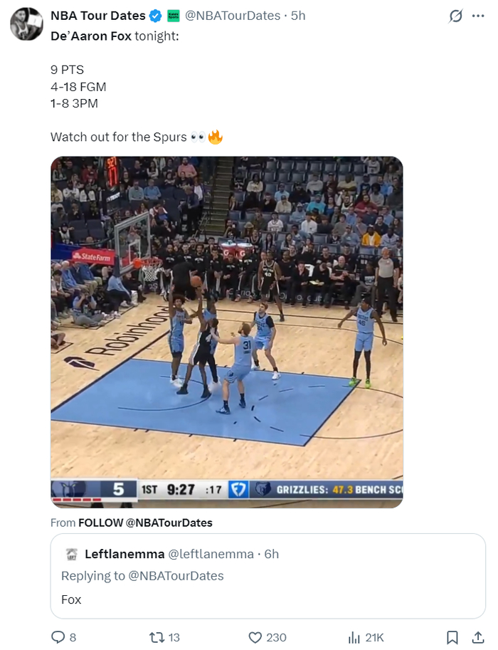 在这场比赛之前,福克斯刚刚接受了Scoop B的专访,福克斯表示在马刺这支充满后场球员的球队打球最主要的是做自己,在防守端也要有组织者的心态,会帮助哈珀更快的适应NBA的节奏。【结果福克斯就是用18中4来做自己】